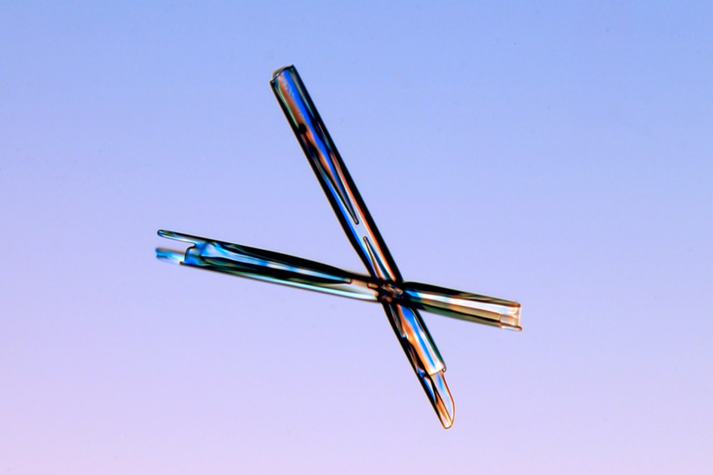 These crystals form in warmer temperatures. They are long and thin. They might look like small hairs on your clothes.