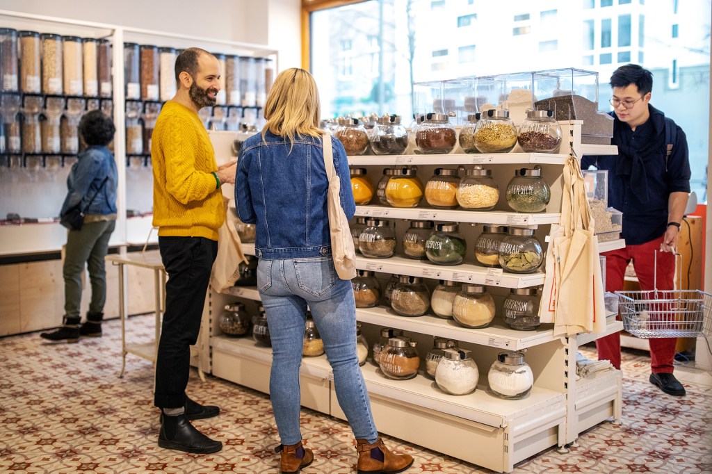 Buy less. Buy only what you need. Choose items with less packaging. This grocery store uses very little packaging.