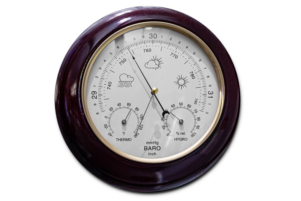 This tool measures air pressure. Rising pressure means dry air. Falling air pressure means rain.