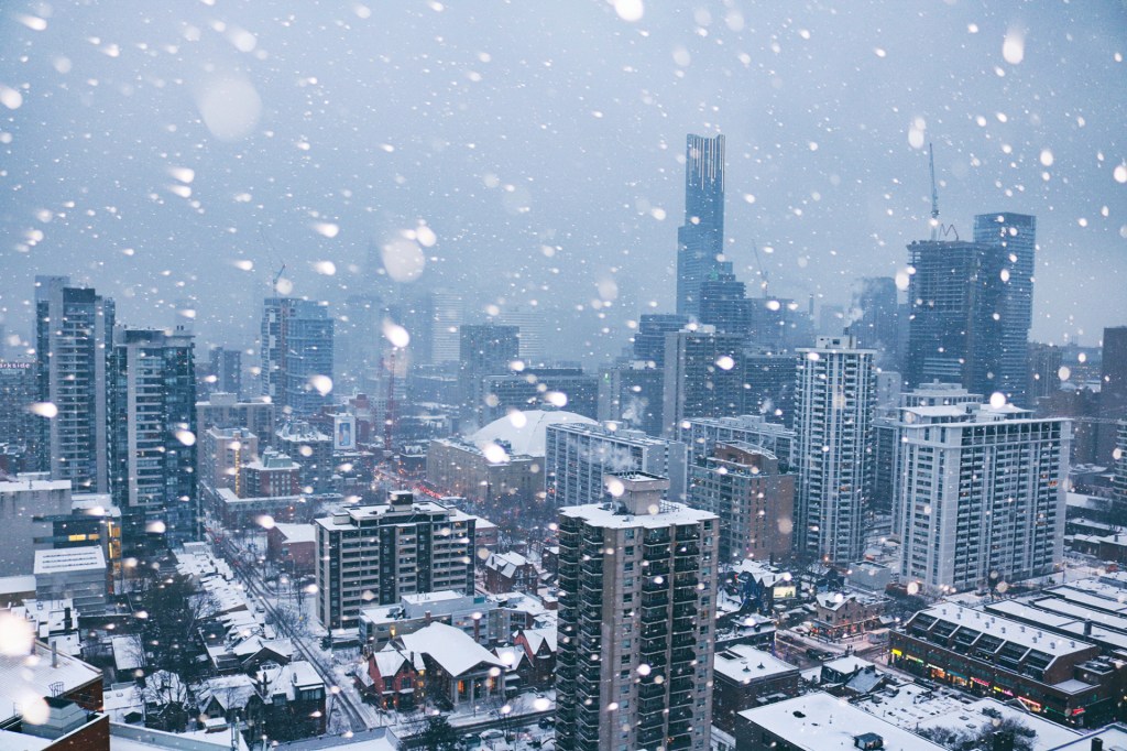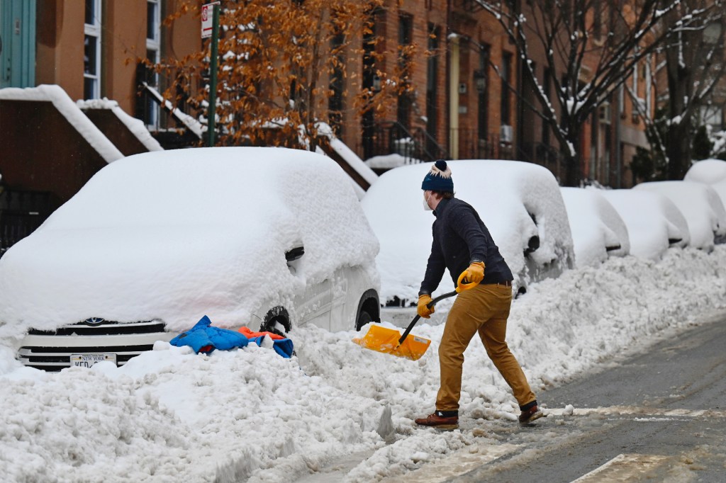 A long and heavy snowstorm is called a blizzard. Wind blows the snow around. This person is clearing a path with a shovel.