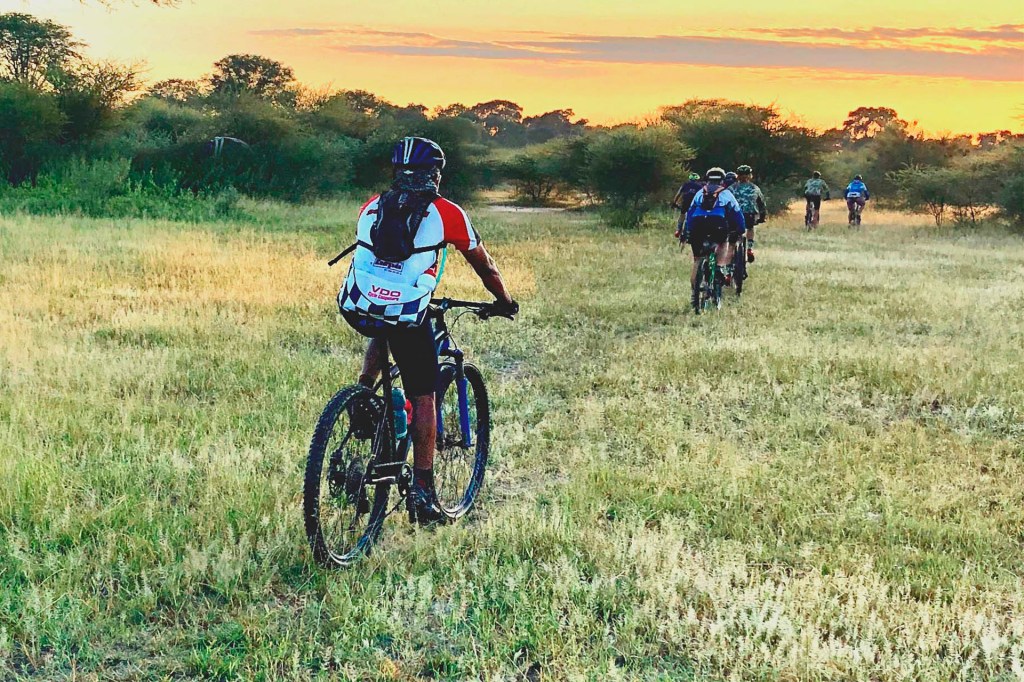 El safari guiado en bicicleta de Natural Selection está en África. Es un recorrido en bicicleta. Los ciclistas verán jirafas y elefantes. Incluso podrían ver leones.