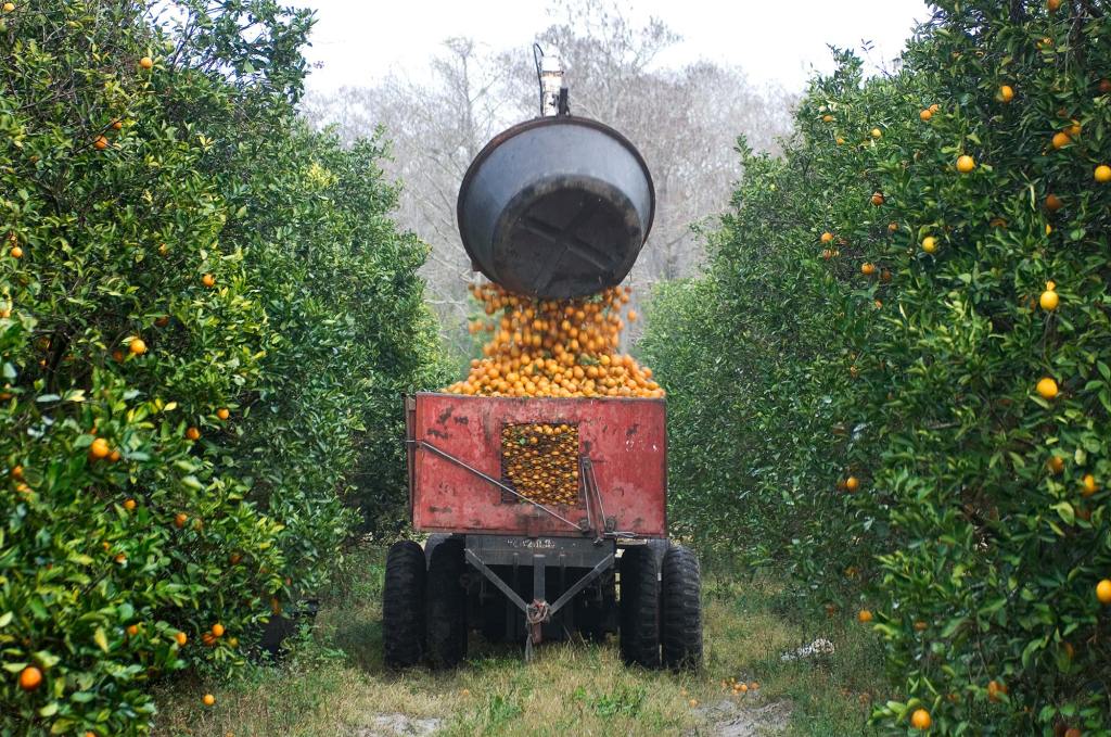 GOOD TIMES A tractor is loaded with healthy, ripe oranges.