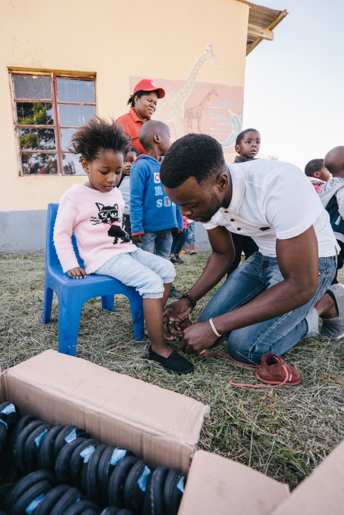 NEW SHOES A volunteer helps a little girl try on her new pair of Toms shoes