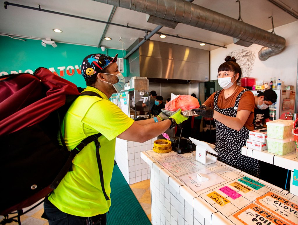 PLAYING IT SAFE Restaurants that had to shut down during the pandemic are starting to reopen, with new rules in place. Here, a delivery person and a restaurant worker wear gloves and masks during a food pickup in Los Angeles, California.