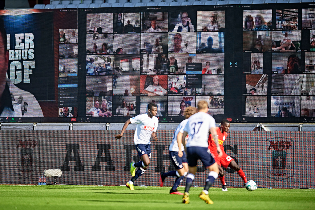 MEET ME ON ZOOM People around the world use Zoom to connect. Soccer fans are shown on LED screens during a game in Århus, Denmark.