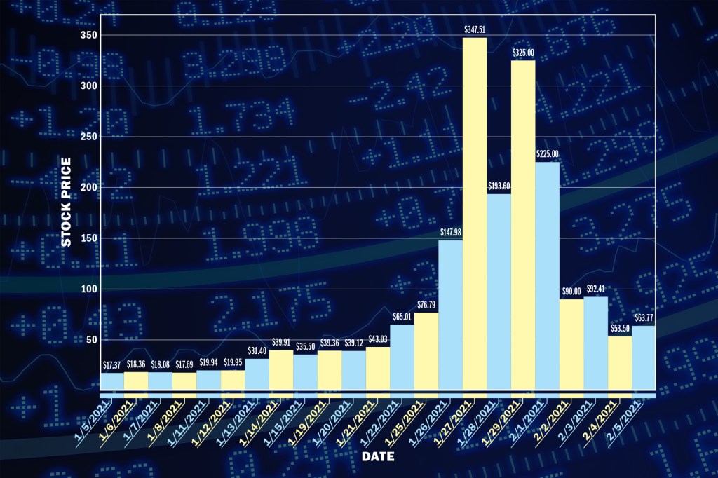 In early January, the price of a share of GameStop was pretty steady. It stayed below $50. Then, on January 22, it went up to $65. And on January 26, it went up a lot—past $147. The next day, it reached $347!